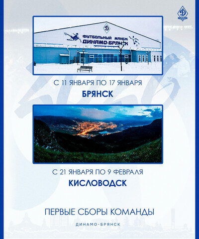 Определились даты первых тренировочных сборов нашей команды. Уже завтра динамовцы соберутся в Брянске и проведут первую в новом году тренировку. 20 января сине-белые отправятся в Кисловодск, а третий сбор команды пройдёт в Абрау-Дюрсо. Его точные даты зависят от жеребьёвки календаря LEON Второй лиги А.
