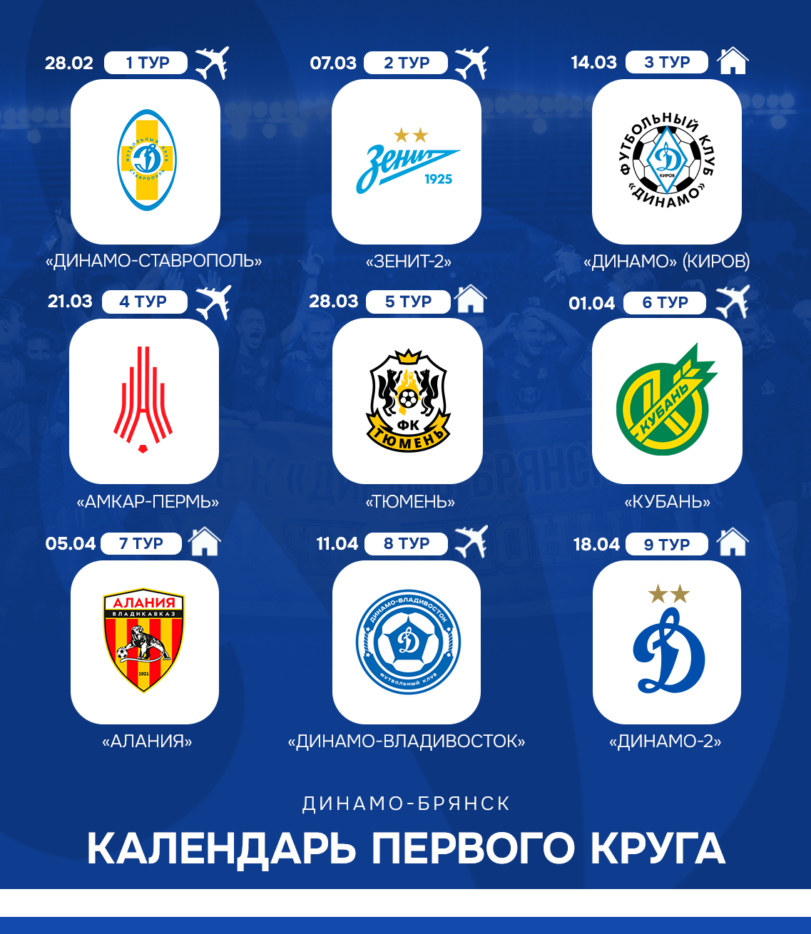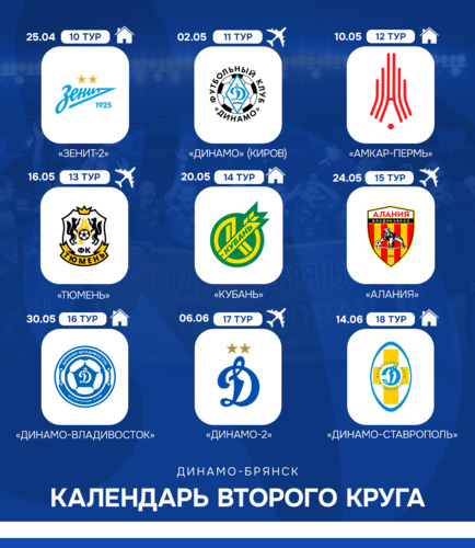 ФУТБОЛЬНАЯ НАЦИОНАЛЬНАЯ ЛИГА представила проект календаря ФК "Динамо-Брянск" в серебряной группе Первенства LEON-Второй лиги А. Сезон динамовцы начнут двумя выездными матчами, а первый домашний поединок запланирован на 14 марта. В этот день мы примем одноклубников из Кирова. Обращаем ваше внимание, что данный календарь не окончательный, в проект могут быть внесены изменения до его официального утверждения.