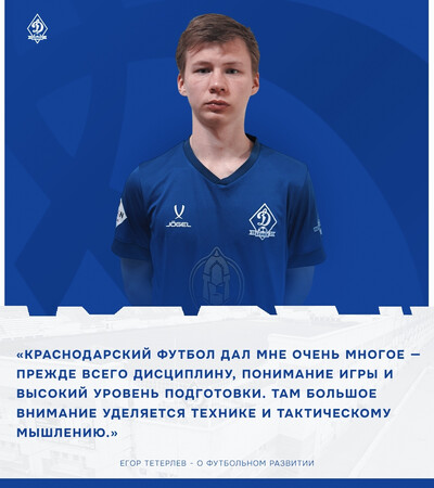 Встречаем нового игрока "Динамо-Брянск"! Полузащитник Егор Тетерлев (09.06.2004). Уроженец Екатеринбурга, проходил обучение в академии "Краснодара", выступал за "Химки-2". В прошлом сезоне играл в составе футбольного клуба "Муром" и отличился четырьмя голевыми передачами, став одним из лучших ассистентов "Серебра". Приветствуем Егора в нашей динамовской семье. Желаем успехов и новых свершений!