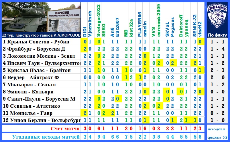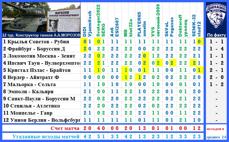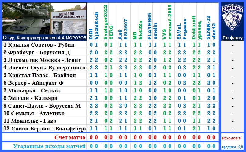 | Ставки на 12 тур: