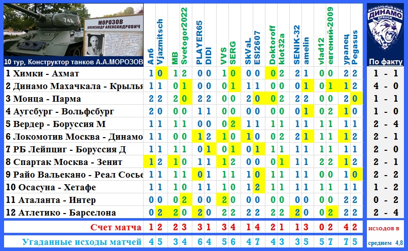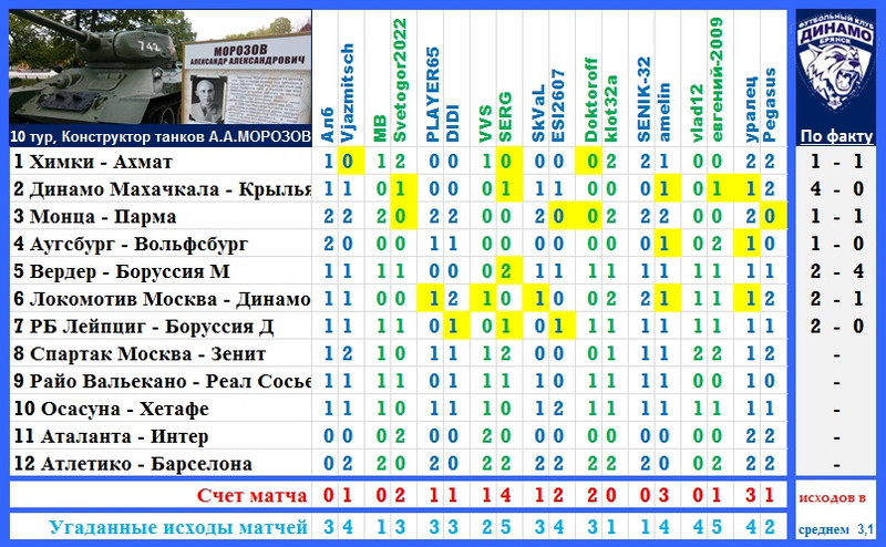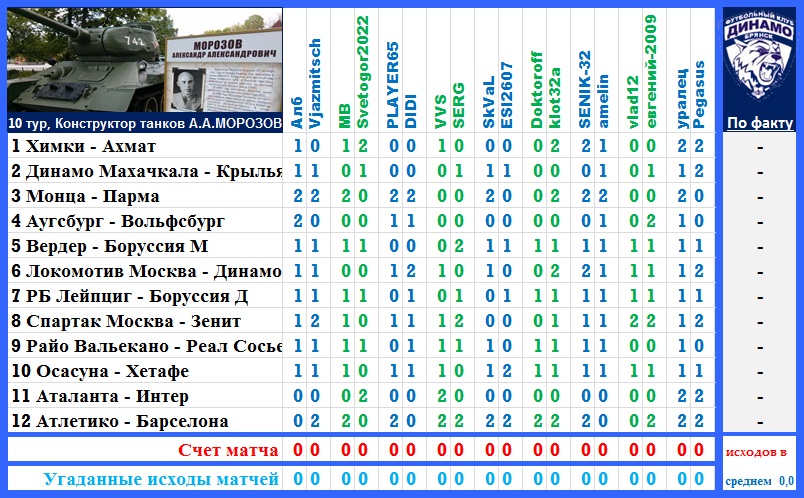 | Ставки на 10 тур: