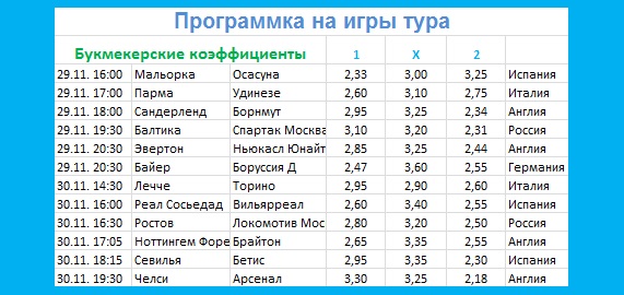 1 Мальорка - Осасуна 2 Парма - Удинезе 3 Сандерленд - Борнмут 4 Балтика - Спартак Москва 5 Эвертон - Ньюкасл Юнайтед 6 Байер - Боруссия Д 7 Лечче - Торино 8 Реал Сосьедад - Вильярреал 9 Ростов - Локомотив Москва 10 Ноттингем Форест - Брайтон 11 Севилья - Бетис 12 Челси - Арсенал