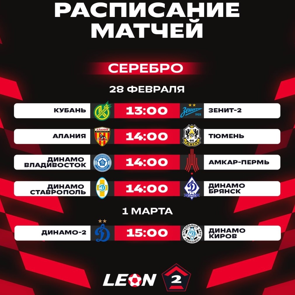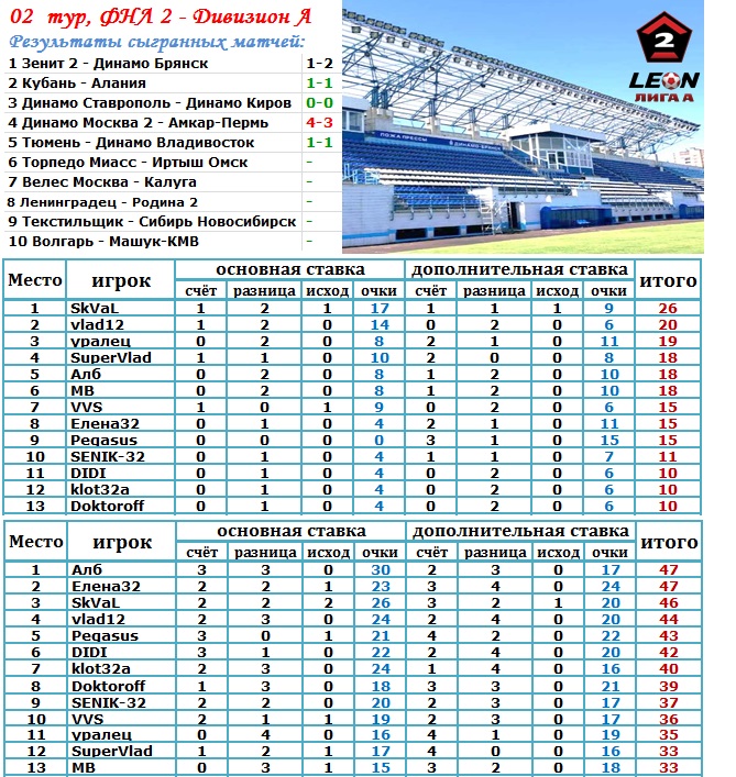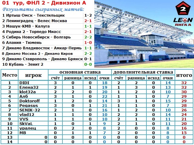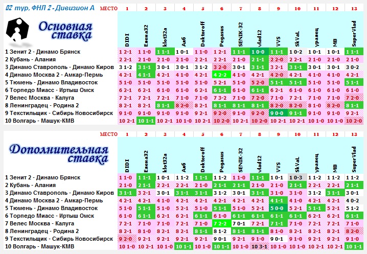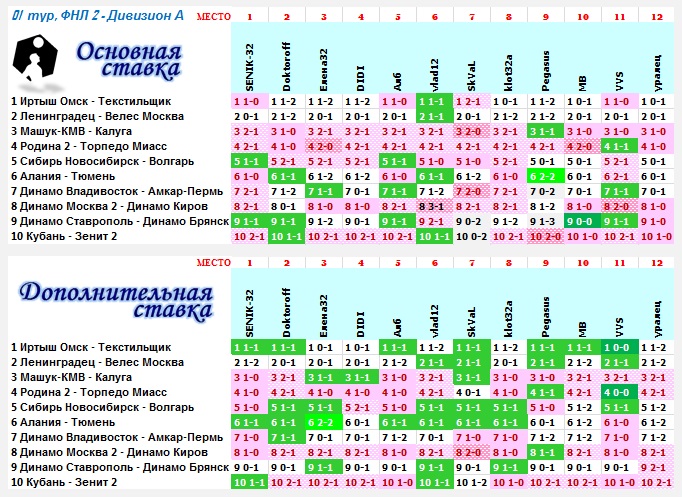 1 Иртыш Омск - Текстильщик 1-2 0-1 2 Ленинградец - Велес Москва 0-2 0-1 3 Машук-КМВ - Калуга 1-1 0-1 4 Родина 2 - Торпедо Миасс 2-0 2-1 5 Сибирь Новосибирск - Волгарь 2-1 2-1 6 Алания - Тюмень 1-2 1-1 7 Динамо Владивосток - Амкар-Пермь 1-0 1-1 8 Динамо Москва 2 - Динамо Киров 1-0 2-1 9 Динамо Ставрополь - Динамо Брянск 1-1 1-2 10 Кубань - Зенит 2 2-1 1-0 *Строчки в ставке менять местами запрещено.