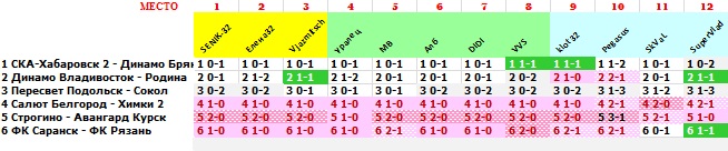 | 32 тур, FNL 2 - Group 3 ПО ФАКТУ: 1 СКА-Хабаровск 2 - Динамо Брянск 0-2 2 Динамо Владивосток - Родина 0-2 3 Пересвет Подольск - Сокол 0-6 4 Салют Белгород - Химки 2 2-0 5 Строгино - Авангард Курск 2-1 6 ФК Саранск - ФК Рязань 0-0