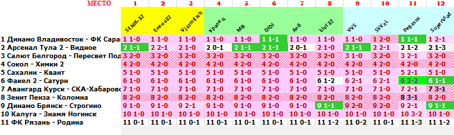 | 35 тур, FNL 2 - Group 3 ПО ФАКТУ: 1 Динамо Владивосток - ФК Саранск 3-3 2 Арсенал Тула 2 - Видное 4-1 3 Салют Белгород - Пересвет Подольск 4-1 4 Сокол - Химки 2 0-2 5 Сахалин - Квант 2-1 6 Факел 2 - Сатурн 0-1 7 Авангард Курск - СКА-Хабаровск 2 2-0 8 Зенит Пенза - Коломна 4-0 9 Динамо Брянск - Строгино 1-0 10 Калуга - Знамя Ногинск 3-0 11 ФК Рязань - Родина 0-1