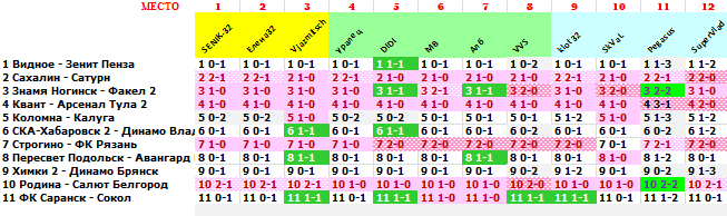 | 34 тур, FNL 2 - Group 3 ПО ФАКТУ: 1 Видное - Зенит Пенза 2-3 2 Сахалин - Сатурн 2-0 3 Знамя Ногинск - Факел 2 1-0 4 Квант - Арсенал Тула 2 0-1 5 Коломна - Калуга 1-2 6 СКА-Хабаровск 2 - Динамо Владивосток 0-0 7 Строгино - ФК Рязань 2-1 8 Пересвет Подольск - Авангард Курск 1-3 9 Химки 2 - Динамо Брянск 3-3 10 Родина - Салют Белгород 1-0 11 ФК Саранск - Сокол 0-2