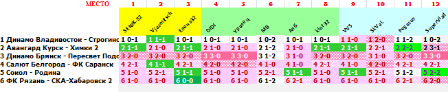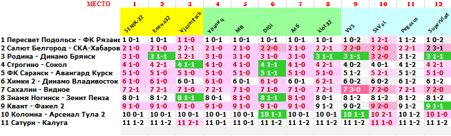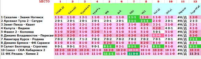 | 37 тур, FNL 2 - Group 3 ПО ФАКТУ: 1 Динамо Владивосток - Строгино 0-0 2 Авангард Курск - Химки 2 1-0 3 Динамо Брянск - Пересвет Подольск 2-0 4 Салют Белгород - ФК Саранск 4-0 5 Сокол - Родина 1-0 6 ФК Рязань - СКА-Хабаровск 2 2-0